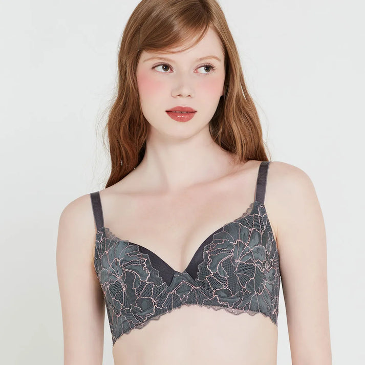 黒地にグレーベースのレースにピンクの花を模した刺繍が大人かわいい