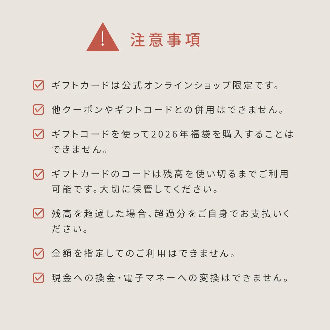 ギフトカードのご利用方法・注意事項については こちら をご確認ください。